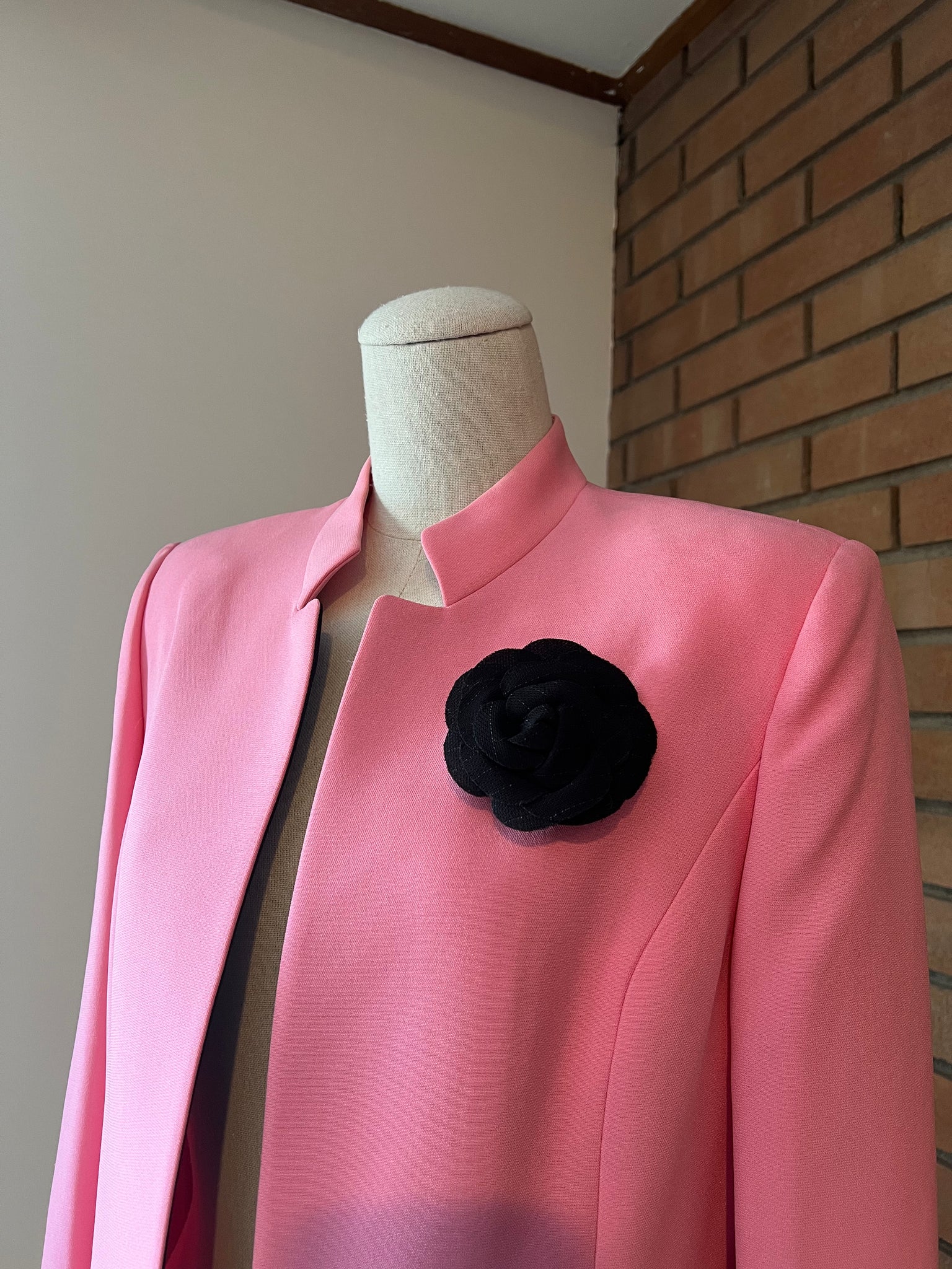 Bright pink blazer with black flower brooch. Tagged size 10P - best fit size small to medium.