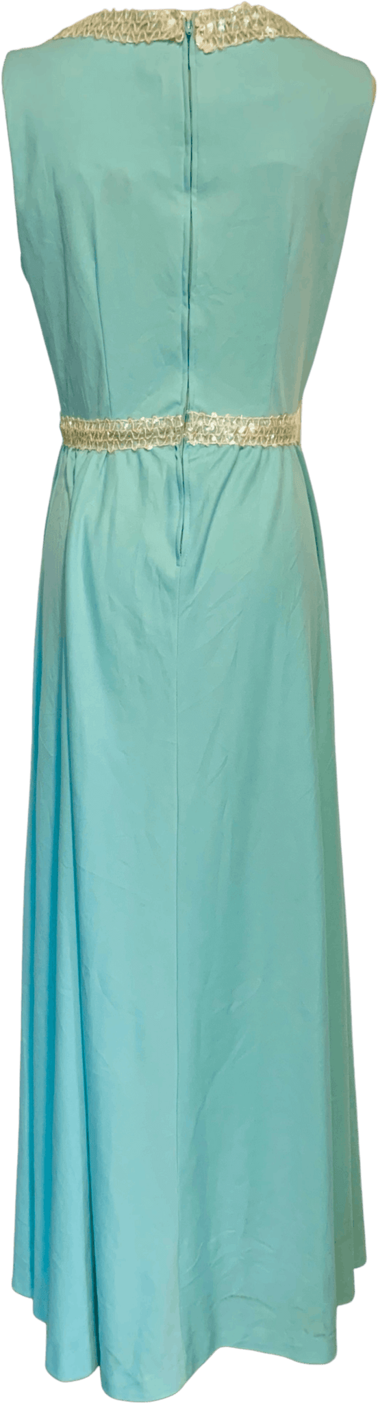 This JCPenney Fashion dress is likely from the 70’s and is a true showstopper! The pretty color pops along with the sequin neckline and waist. Not on the tag, but likely a poly blend and has a bit of stretch for optimal flowiness!