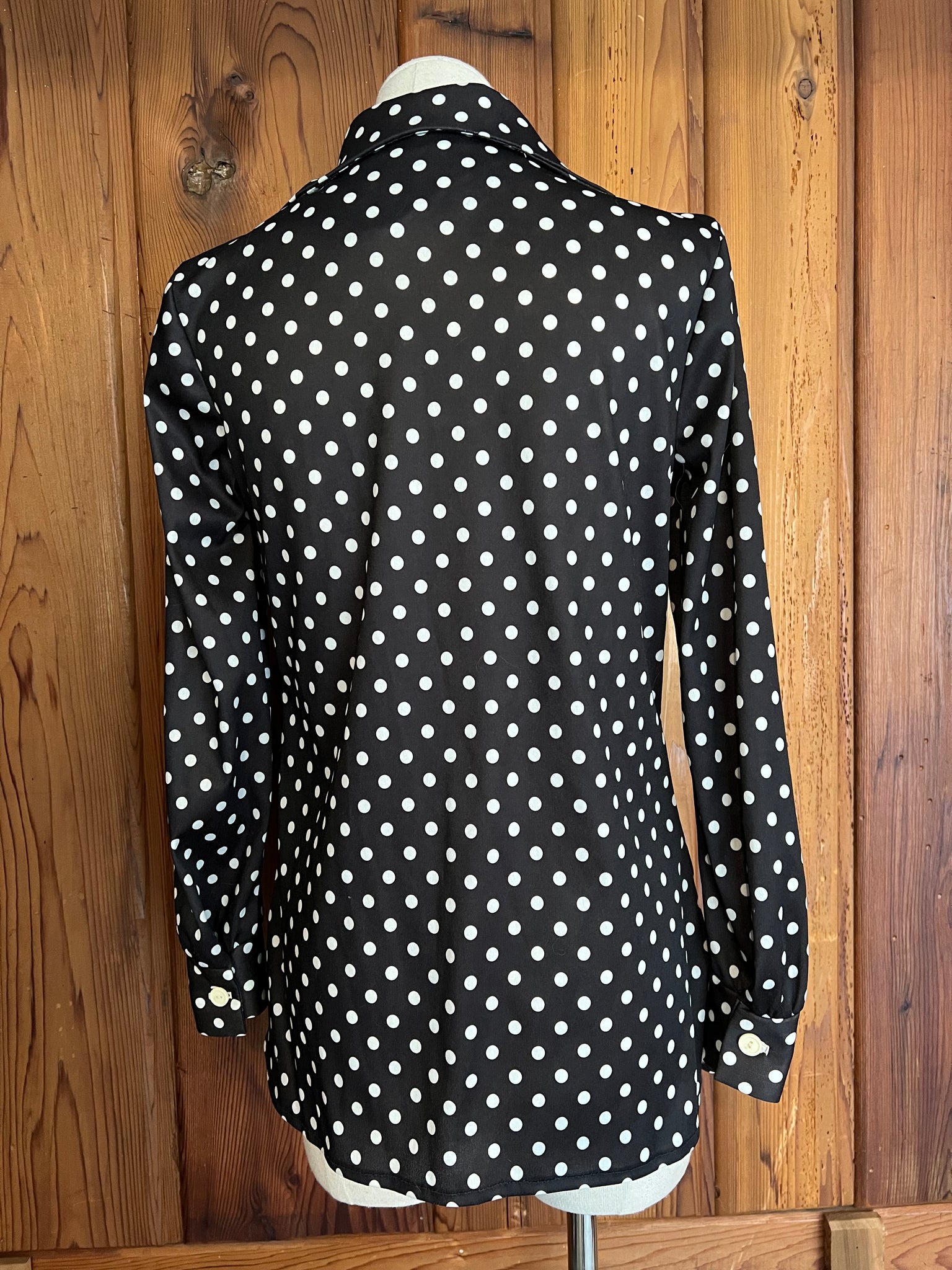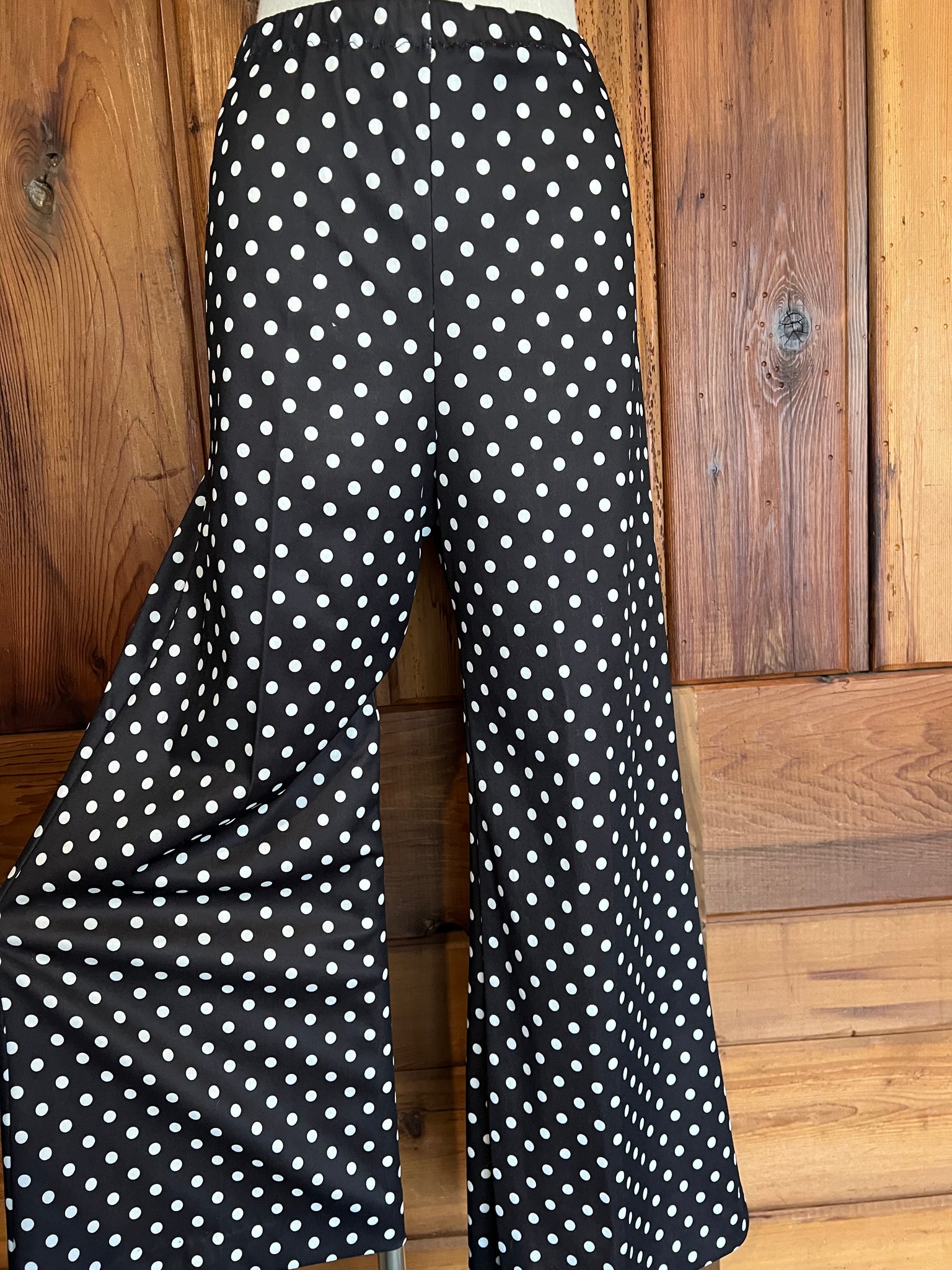 Versatile two piece set featuring black and white polka dot design, button up shirt, and elastic waist flared pants.